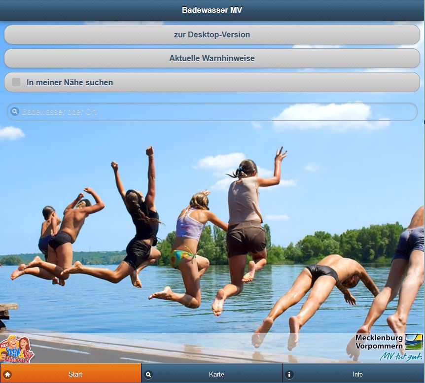 In der Themenkarte werden Badegewässer in M-V dargestellt. Konkret handelt es sich um EU-gemeldete Badegewässer mit überregionaler Bedeutung und andere überwachte regionale Bademöglichkeiten. Die Einstufung der Badegewässerqualität ist durch EU-einheitliche Symbole gekennzeichnet.